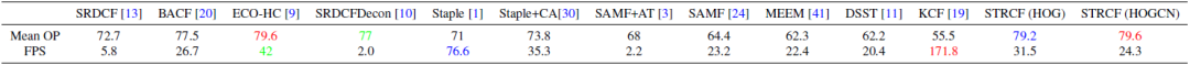 表 1 : OTB-2015 上具有人工设计特征的追踪器的平均 OP (% ) 和追踪速度(FPS)的结果。最好的三个结果分别以红色、蓝色和绿色字体显示。