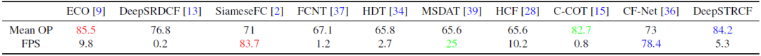 表 2 : OTB-2015 上具有深度特征的追踪器的 OP(% ) 和速度(FPS)结果。最好的三个结果分别以红色、蓝色和绿色字体显示。