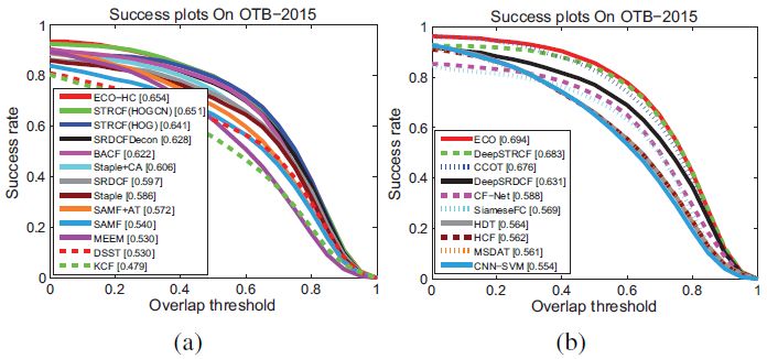 图 3 : OTB-2015 数据集上与最先进追踪器的「追踪成功率 vs 重叠阈值」的比较。( a ) 具有人工设计特征的追踪器。( b ) 具有深度特征的追踪器。