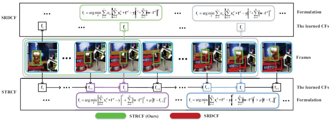 图 2 : SRDCF 和 STRCF 在模型学习方面的比较。SRDCF 从历史追踪结果中学习到具有多个样本的相关滤波器,并着重于最近的样本。因此,它可能遭遇对最近不准确样本的过拟合问题,并且在有遮挡的情况下导致追踪失败。相比之下,本文提出的 STRCF 使用来自当前帧的样本和学习到的 CF f_ t-1 来训练 CF f_t。利用在线 PA,STRCF 可以在遮挡情况下通过被动更新相关滤波器来成功追踪目标。
