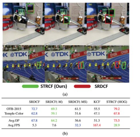 此外,作为在线 PA 算法 [6] 的扩展,STRCF 还可以在外观大幅变化的情况下实现比 SRDCF 更鲁棒的外观建模。图 1(a)展示了对具有遮挡和变形的两个序列的追踪结果。与 SRDCF 相比,引入时间正则化后的 STRCF 对遮挡具有更强的鲁棒性,同时能够很好地适应较大的外观变化。