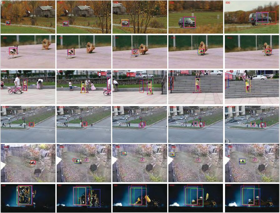 图 4 :对 6 个视频序列 (即车辆、狗、女孩 2、人物 3、熊猫和瞬态) 的定性评估。图中分别给出了不同颜色的 STRCF、ECO-HC、BACF、SRDCF 和 SRDCFDecon 的结果。