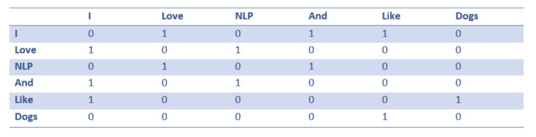 通过这个简单的矩阵,我们能够获得非常有用的信息。例如,「love」和「like」这两个词对名词(NLP 和 dogs)的计数都是 1。他们对「I」的计数也是 1,这表明这些词很可能是某种动词。对于远比一个句子更大的数据集,可以预料的是这种相似性会体现得更加清晰,因为「like」、」love」和其他具有相似上下文的同义词将开始具有相似的向量表示。