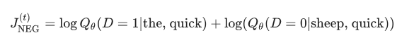 为了简单起见,我们设定 num_noise = 1,我们选择 sheep 作为一个噪声样本。接下来我们计算这对观察到的和有噪声的例子的损失,即在」t」时刻的目标函数变成: