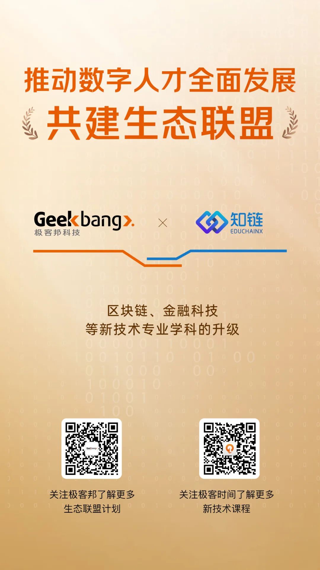近日,极客邦科技与中国领先的区块链和金融科技产业人才培养整体解决方案提供商知链科技达成战略合作协议,双方就区块链、金融科技等新技术专业学科的升级进行深入合作。