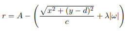 在强化学习中,奖赏函数会引导智能体学习,对最终学习效果起着至关重要的作用。针对主动目标跟踪任务,我们需要设计一个奖赏函数以引导智能体学习。最直观的想法应该是在目标接近期望位置时给与奖励,在远离时给与惩罚。因此,我们以跟踪器为中心定义了一个平行于地面的坐标系,y 轴指向相机前方,x 轴由相机左方指向正右方。对应的,我们用 (x,y) 和ω分别表示目标相对跟踪器的位置和朝向。从而,我们得到了如下一个奖赏函数: