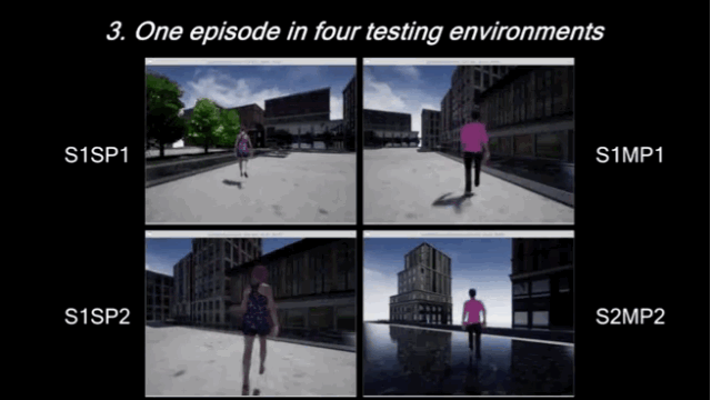 强化学习的训练需要大量试错,这导致在真实环境下训练主动跟踪器基本上是不可能的。因此,我们基于两种游戏引擎(VizDoom 和 Unreal Engine)分别构建了不同的跟踪场景用于训练和测试,如下图所示: