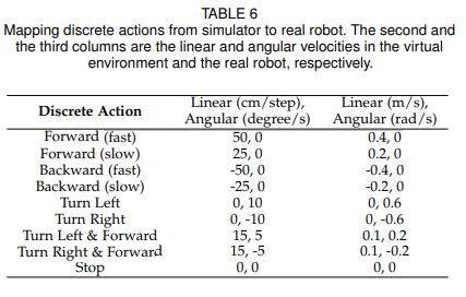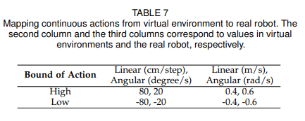 我们也对连续动作空间下的表现能力感兴趣,因此我们尝试了一种二维的动作空间,由线速度和角速度组成。具体的虚拟和现实的设置如下表: