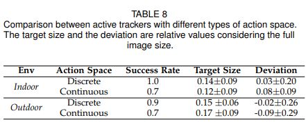 通过上表可见,采取离散动作的跟踪器在两个场景中都可以取得更高的成功率。在室外,离散动作可以让目标大小保持更加稳定(更小的方差)。无论是室内室外,基于离散动作的跟踪器都能保证更小的平均偏差。综合这些结果,说明了采用离散动作可以帮助模型更好更鲁棒地迁移到真实场景。我们猜想对动作空间离散化可以使得智能体对场景中的干扰和机器人控制系统的噪声都更加鲁棒,而连续空间会更加敏感。