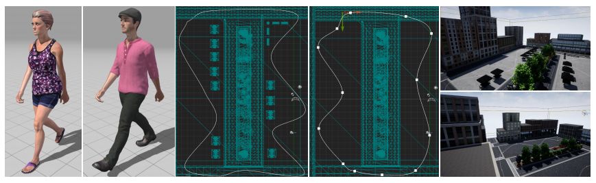 Unreal Engine 环境的地图和示例。从左到右分别为两种外观的目标(Stefani 和 Malcom),两种轨迹(Paht1 和 Path2)和地图(Square1 和 Square2),对应的两种场景的示例,通过不同组合构成了不同的跟踪场景。我们用其中一种组合进行训练,其余组合环境进行测试。