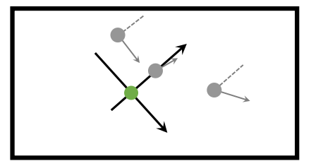 绿点代表了跟踪器,灰点代表了不同位置和朝向(箭头指向)的目标,虚线与跟踪器的 y 轴相平行。