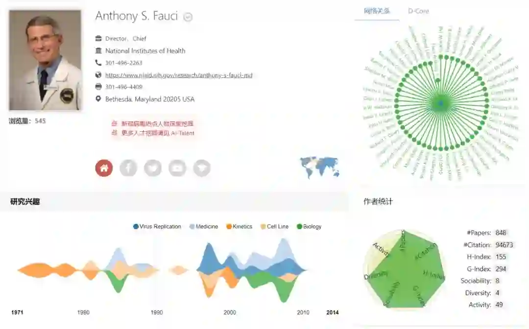 复制网址 https://2019-ncov.aminer.cn/ 或点击文末阅读原文,查看 Anthony Fauci 学术大数据完整信息
