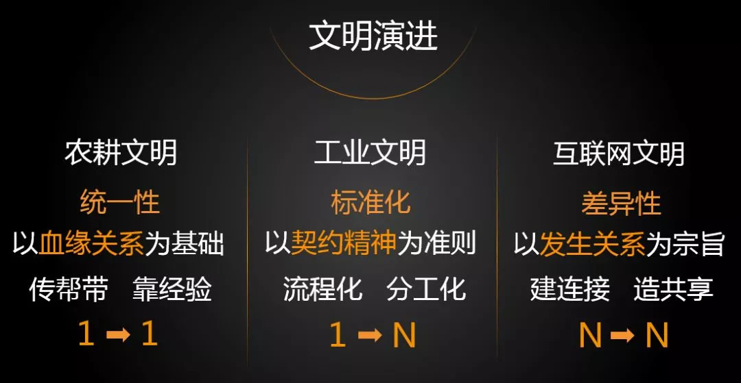 第三阶段相当于互联网文明。企业发展强调发生关系的逻辑,在各个单元之间制造连接。从订单逻辑看,农耕文明属于加减法逻辑,订单需一个一个积累;工业文明属于乘除法逻辑,订单流程协同,整体效率更高;互联网文明属于N次方逻辑。