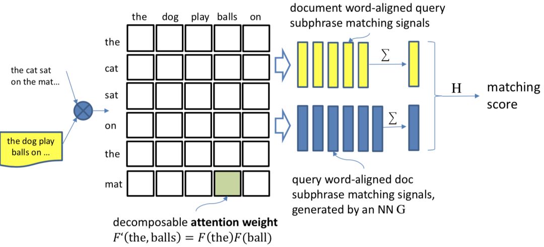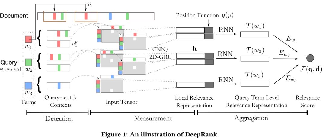 CIKM2017提出的DeepRank模型,基于一个有趣的假设,用户搜索query后,在展现的doc里面 ( title ),往往更关注的在doc中和query匹配的词的上下文。有个关于眼球实验的paper也做了类似的验证。比如,你搜索了"佳能相机价格"后,在展现结果里,往往会快速的扫描"佳能相机"前后相关的词,例如相关型号之类的,以及"价格"前后的信息,例如具体多少钱的信息,这种假设在信息检索是比较make sense的。