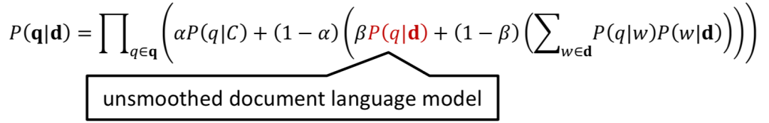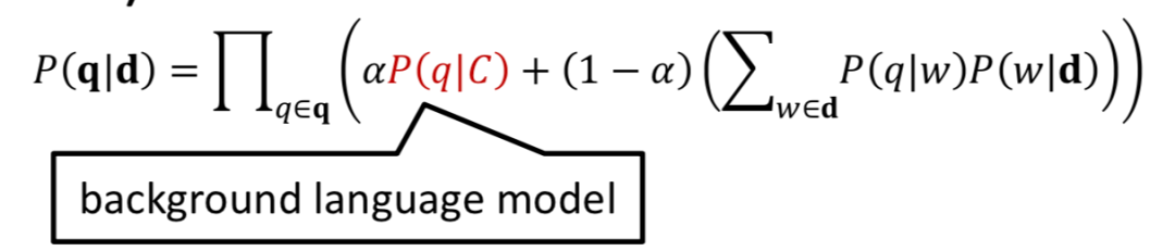 上述公式将doc->query的翻译过程拆成了两个模型的连乘,对于很多稀疏的term,一旦出现某个概率为0,最终结果也将变为0。为了防止这种情况就需要做平滑,下述公式通过引入background language model的p(q|C),并且用参数alpha进行线性组合来做平滑。C代表的是整个collection。