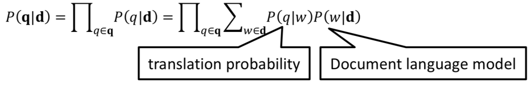 但是这种方法也存在问题,就是self-translation问题。原本这个问题是在机器翻译过程中,但是在query和doc过程中,源语言和目标语言都是同一种语言,也就是doc中的每个term都有可能映射到query中相同的term,即p(q=w|w)>0。因此,CIKM2010年引入了unsmoothed document language model,也就是p(q|