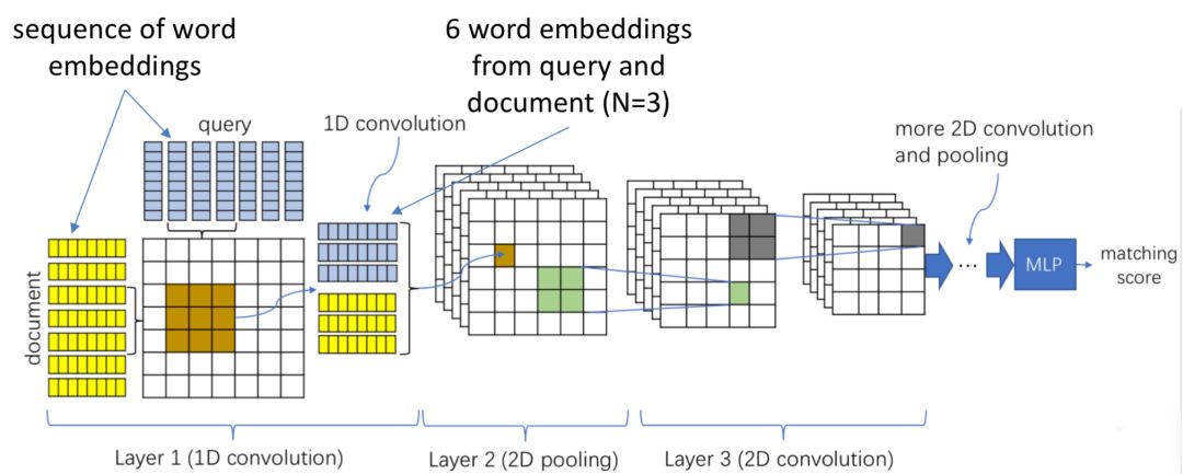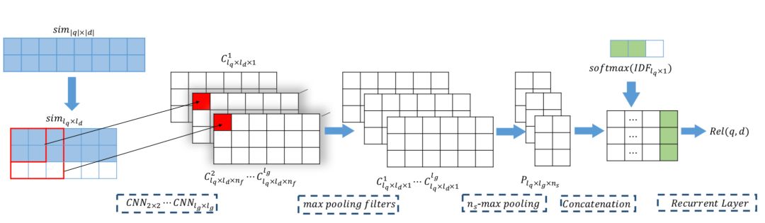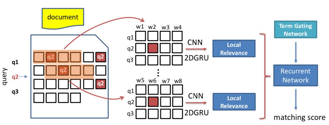 对第二步得到的每一个query-centric contexts以及query对,使用CNN或者2D-GRU的网络及结构提取信息得到匹配分数