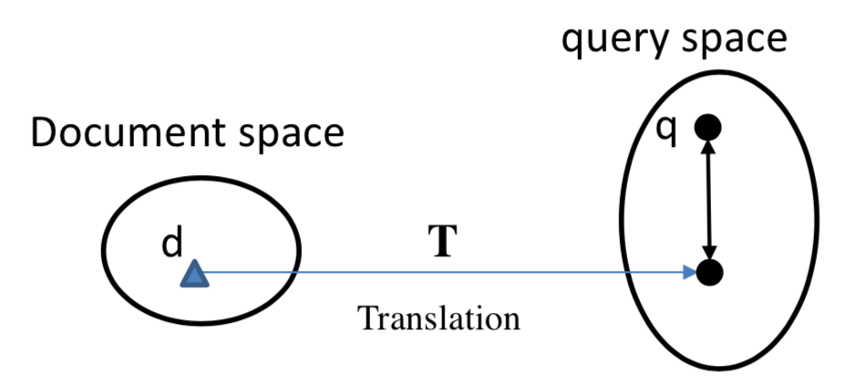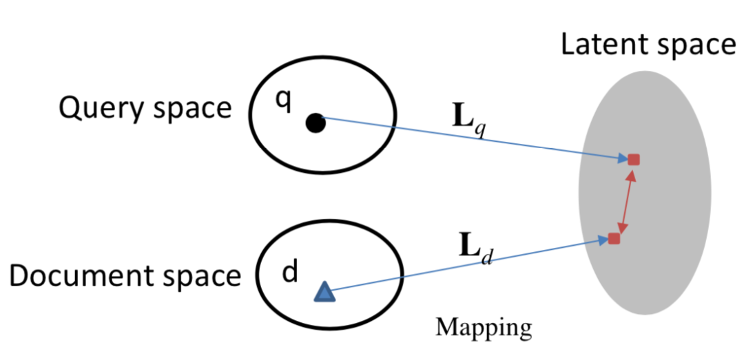 更早之前有基于term的统计方法,例如TF-IDF等,而从match的角度,按照query和doc是否映射到同一个空间,可以分为两大类,一类是基于隐空间的match,将query和doc都映射到同一个latent space,如图2.2所示;第二种是基于翻译空间的match,将doc映射到query的空间,然后学习两者的匹配,如图2.3所示:
