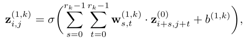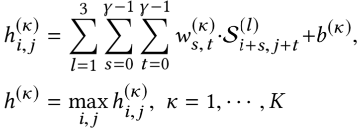 对于输入向量S,引入K个kernel进行卷积表达,每个kernel卷积核大小为γ*γ。对于卷积输出第i,j个元素,其表达为S