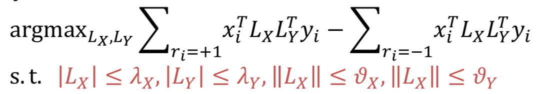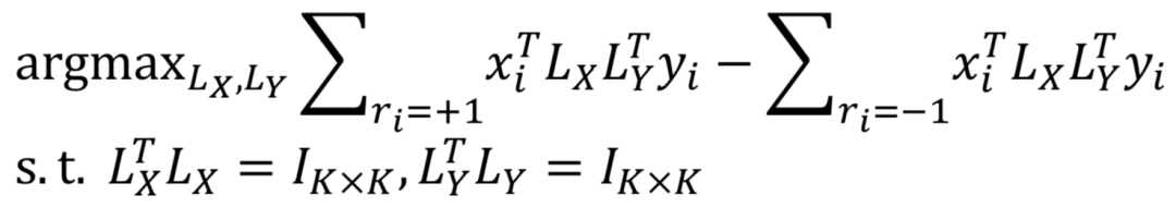 上述用映射后的空间的向量点积作为匹配分数,在求最优化时,目标就是最大化正样本query-doc的pair对,以及负样本query-doc的pair对的向量点击差异,并且满足两个转化矩阵L