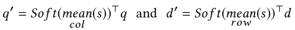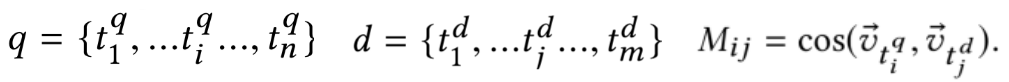 前一步得到query中的term,以及在doc中对应的query-centric contexts后,需要进行匹配得到交互矩阵。对每个query中的第i个term,以及query-centric contexts中的第j个term,用s