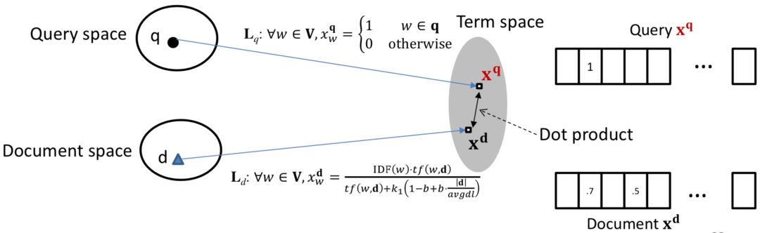 对于第一种方法,基于隐空间的匹配,重点是将query和doc都同时映射到同一空间,经典的模型有BM25。BM25方法核心思想是,对于query中每个term,计算与当前文档doc的相关性得分,然后对query中所有term和doc的相关得分进行加权求和,可以得到最终的BM25,整体框架如图2.4所示