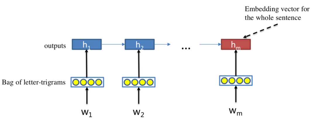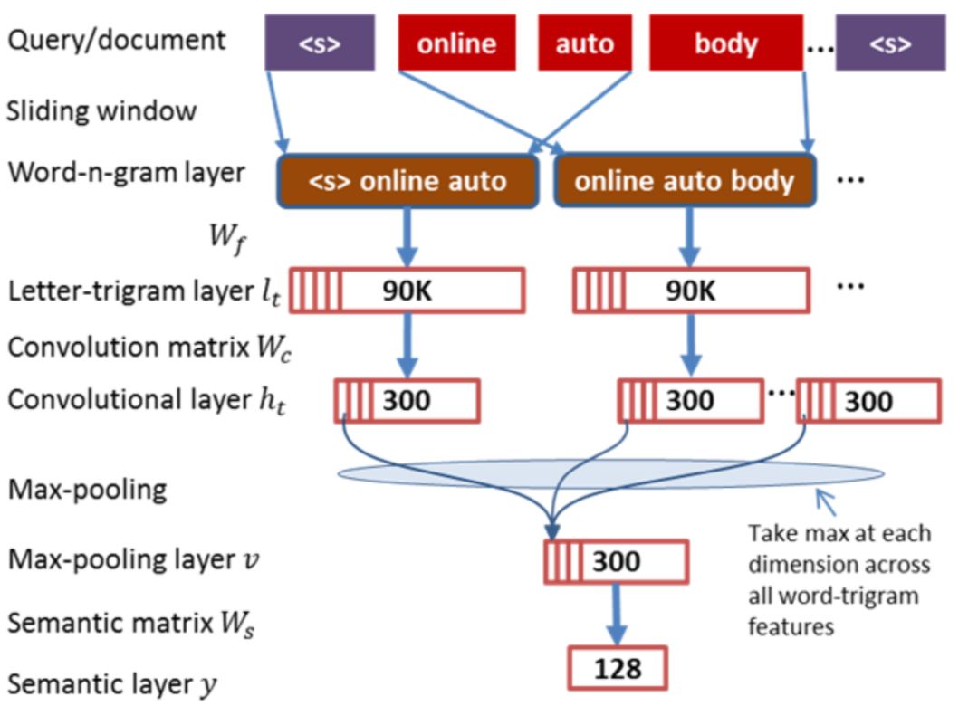 在DSSM中表示层采用的是词袋模型 ( bag of words ),也就是说不区分word的输入顺序,整个句子的所有单词都是无序输入的。这也为后面各种DSSM-based模型提供了很多优化工作。