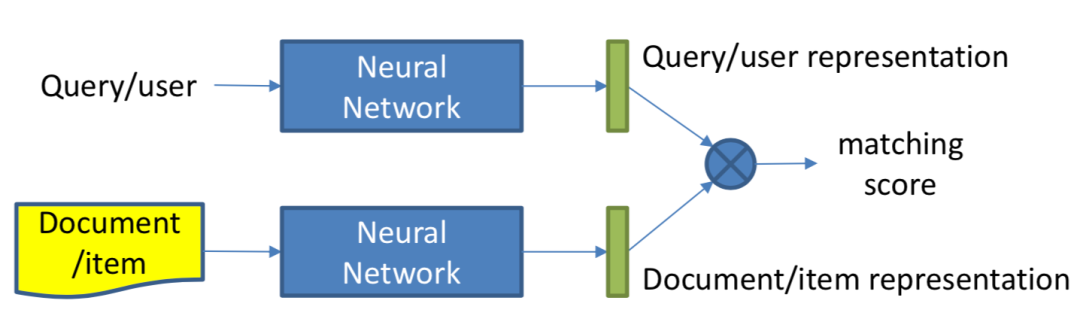 本章主要讲述第一种方法,representation learning,也就是基于表示学习的方法,这种方法会分别学习query和doc ( 放在推荐里就是user和item ) 的representation表示,然后通过定义matching score函数,例如简单点的做法有向量点积、cosine距离等来得到query和doc两者的匹配,整个representation learning的框架如图3.1所示,是个经典的双塔结构:
