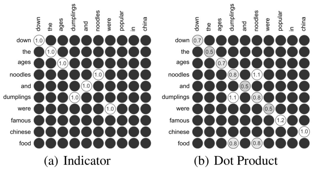 来表示,和MatchPyramid模型一样,文中使用了indicator和cosine两种方法,indicator相当于是精确匹配,只有query的第i个term和doc的第j个term完全一致才s