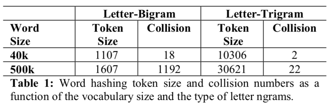 通过word hash的方式有两个好处,第一是可以大大减少原始输入空间。以4万单词为例,采用trigram的hash方法以后,将压缩到1万左右的输入空间。而对于一个50万单词的词表的话,将压缩到3万,与此同时trigram的冲突率只有22/50w=0.0044%。
