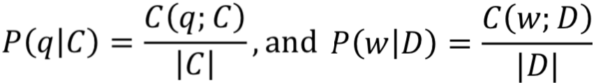 从贝叶斯公式,可以得到p(q|C)以及p(w|D)的表达;C(q;C)表示的是当前query的单词q在整个collection出现的次数;C(w;D)表示的是单词w在文档D中出现的次数