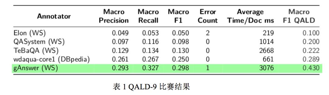 GAnswer 参加了欧盟组织的 QALD-9 (https://project-hobbit.eu/challenges/qald-9-challenge/) 的评测比赛,并取得了第一名的成绩。
