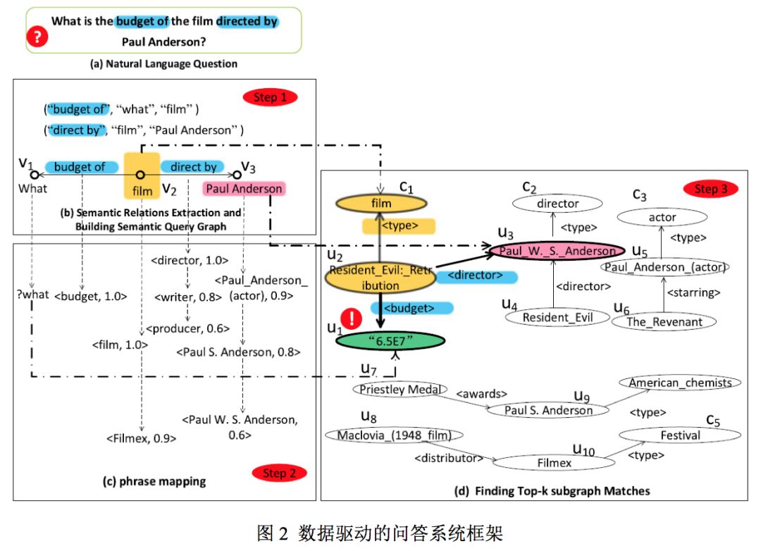 如图 2 所示,节点 V3(PaulAnderson) 对应的三个后选中,虽然 <Paul Anderson(actor)> 和 <Paul S. Anderson> 的得分较高,但在查询匹配阶段知识库中找不到与 SQG 匹配的包含这两个点的子图,所以我们将他们剔除(消歧),选择映射 <PaulW. S. Anderson>。