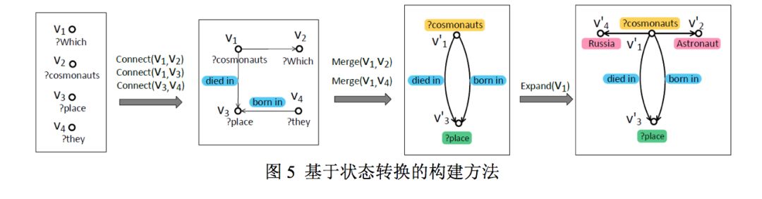 3) 基于状态转换的构建方法 (EMNLP2018[3]) 使用序列标注模型识别句中节点后,在训练好的子图打分模型的监督下通过预定义的四种状态转换操作逐步生成语义查询图,最后使用多通道卷积神经网络 (MCCNN) 识别相应关系。该方法可以生成更复杂的查询图结构(例如带环的查询),在 QALD-6、WebQuestions 和 ComplexQuestions 测试集上 F1 得分分别为 0.80, 0.536 和 0.543。