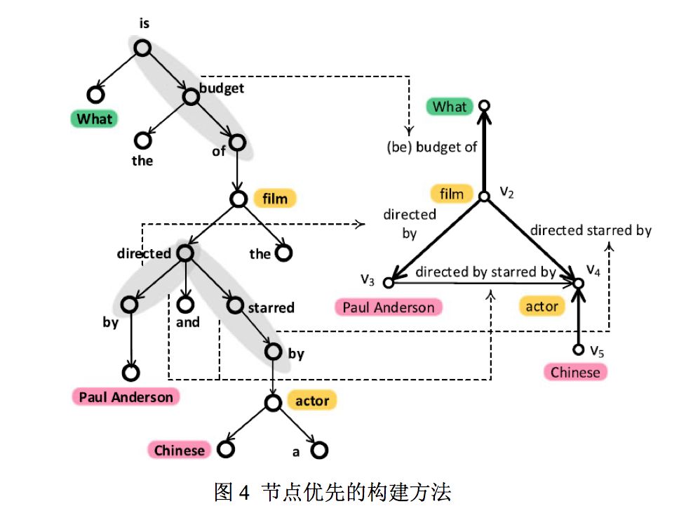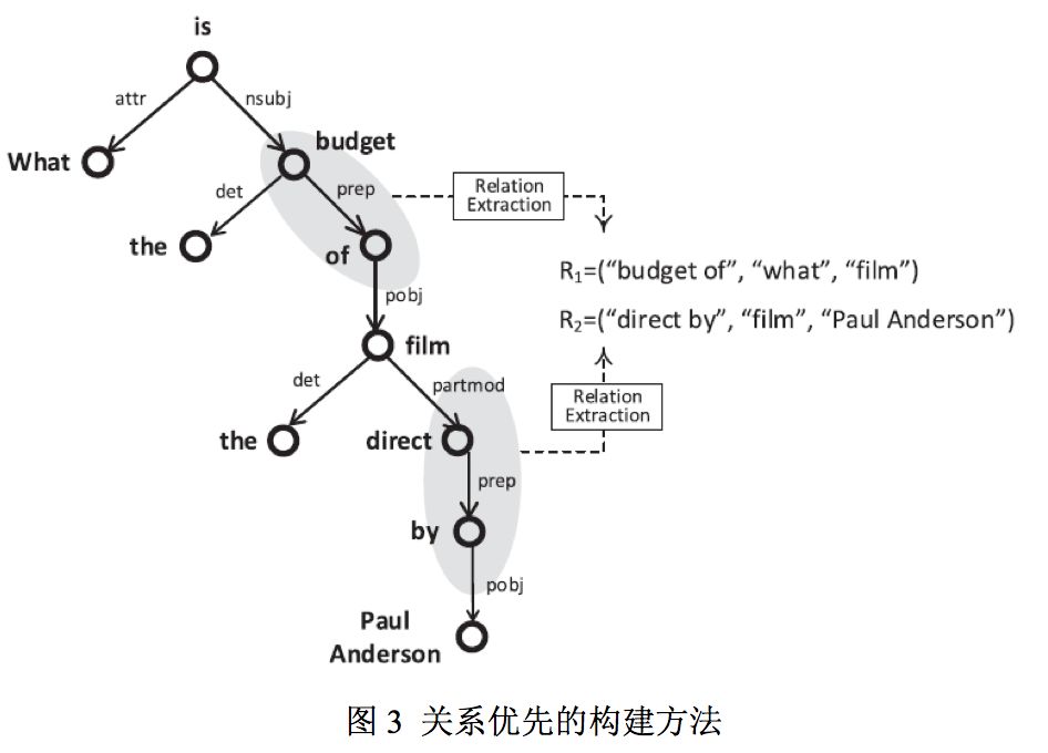 1) 关系优先的构建方法 (SIGMOD2014[1]) 先通过谓词复述词典识别问题中的关系(谓词),再通过启发式规则确定关系两边的节点(实体/疑问词)。一些相关工作中使用神经网络来进行关系抽取的方法往往将问题整体作为输入,只能输出一个识别出的关系从而不能回答多跳问题。而该方法通过句法依存树进行模板匹配能识别出多条关系从而可以回答多跳问题。其在 QALD-6 和 WebQuestions 测试集上 F1 得分分别为 0.55 和 0.312。