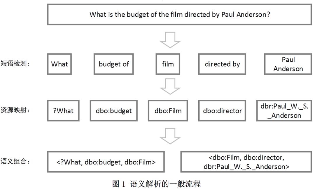图 1 展示了语义解析的基本流程,其中主要有两个难点,一是语义消歧(资源映射),即如何将自然语言问题中具备歧义的实体短语和关系短语对应到知识库中确定的实体和谓词上。例如短语 “PaulAnderson” 在知识库中可能有多个候选实体如 < Paul S.Anderson> 和 < Paul W. S. Anderson>,我们需要消除错误的歧义,找到正确的映射。二是查询构建(语义组合),即如何将映射后的实体和谓词拼接成一个完整的查询。