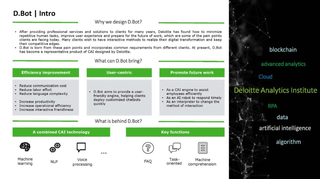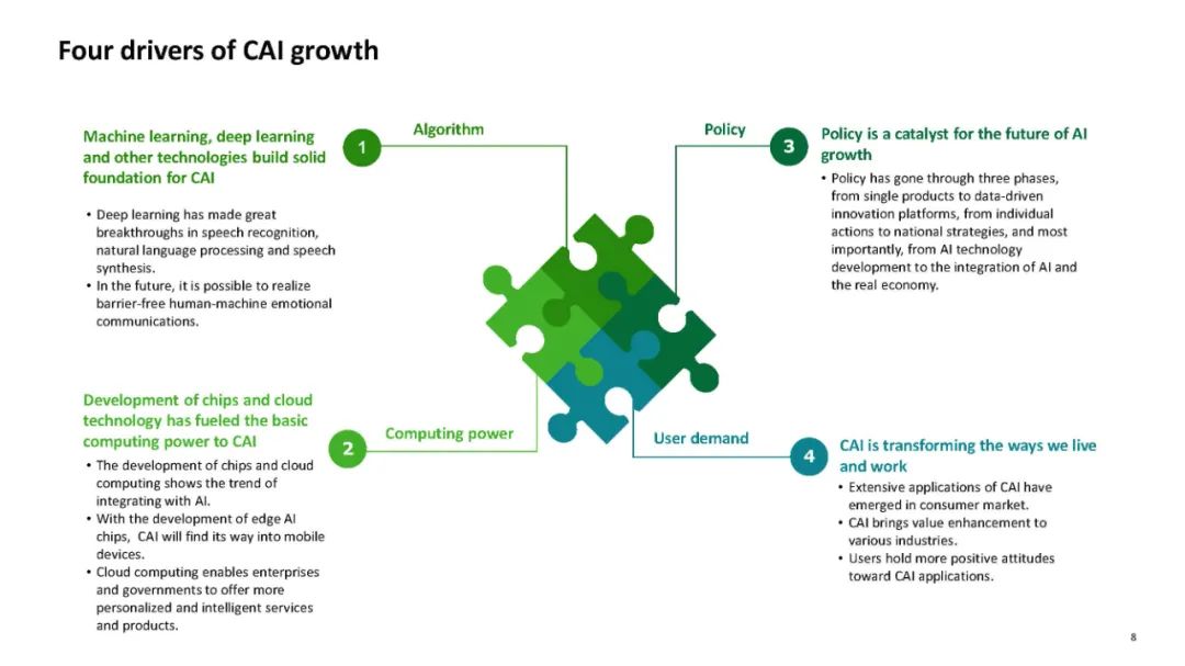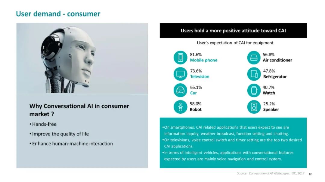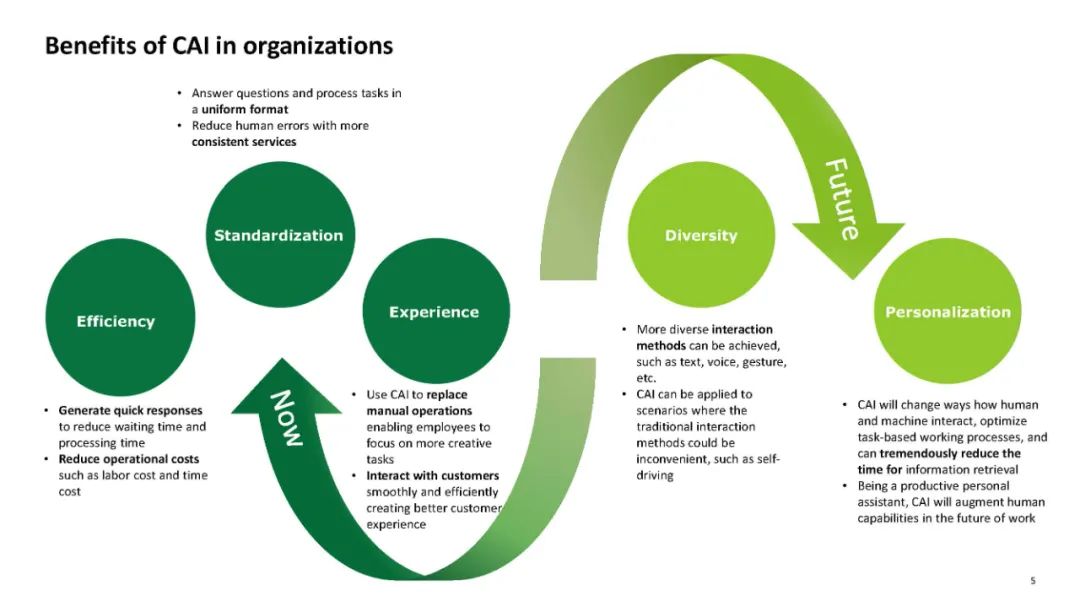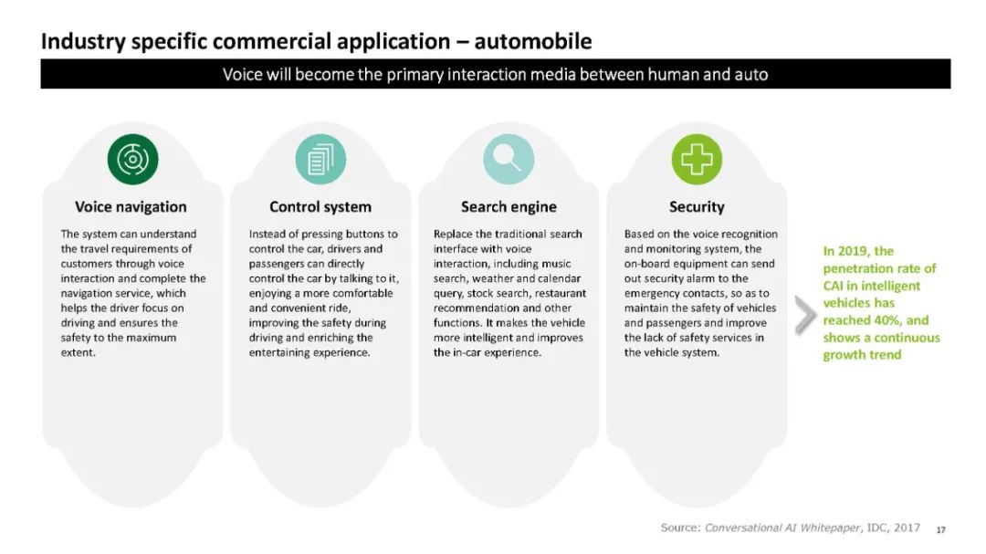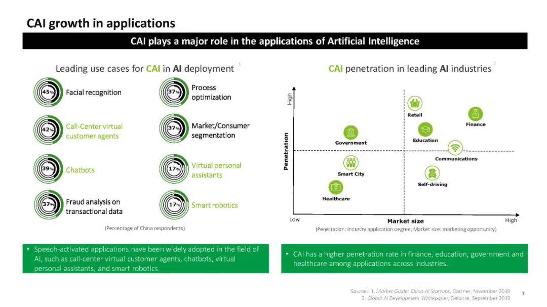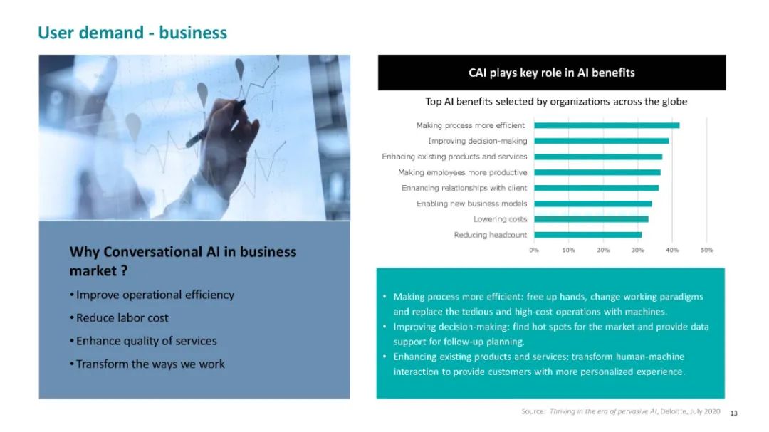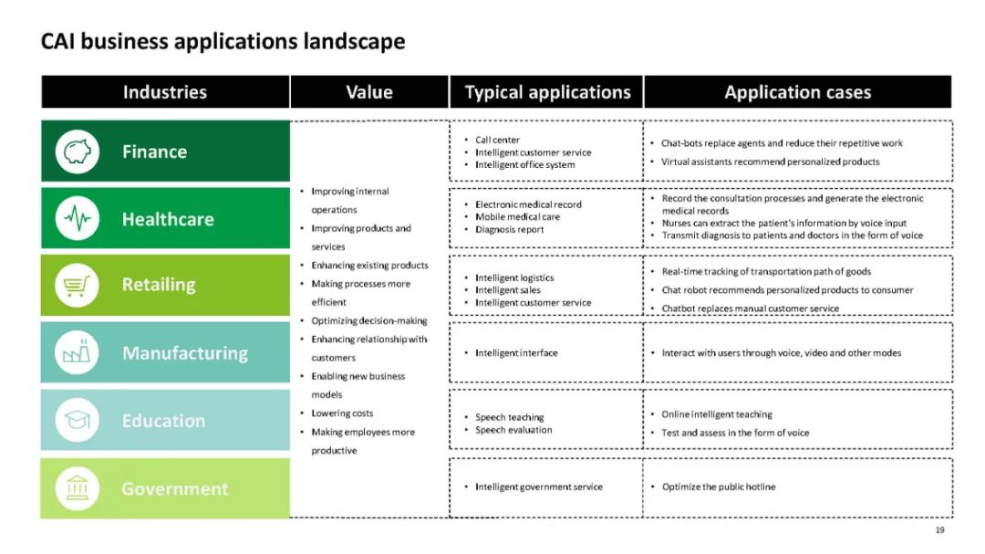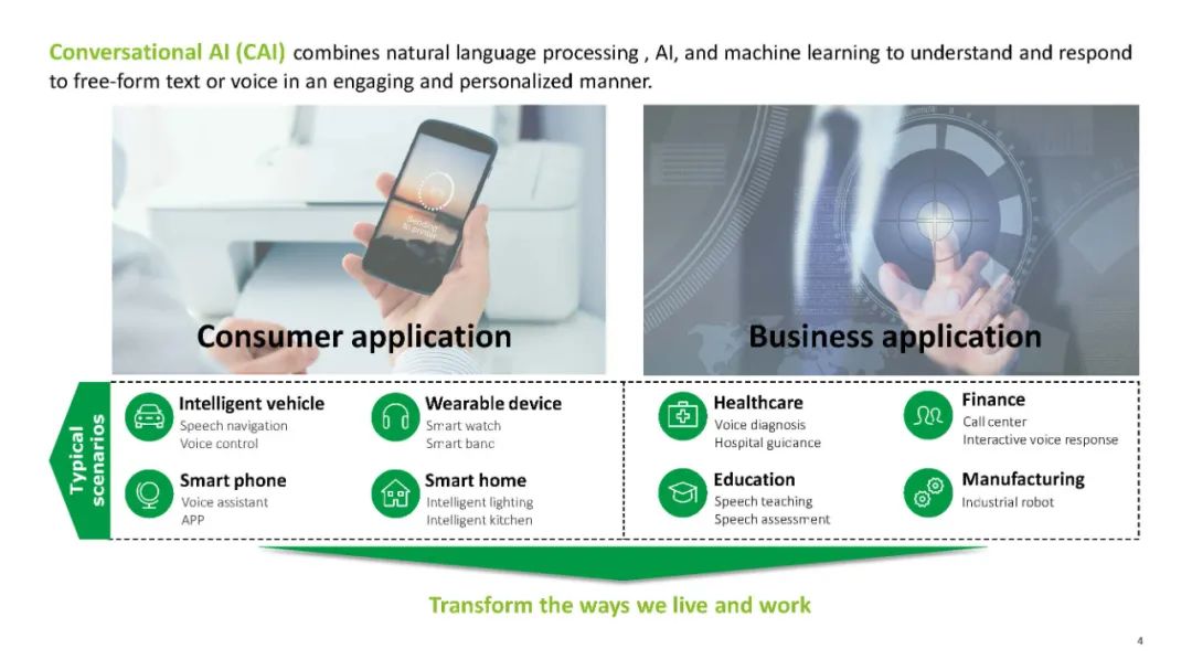 基于语音的交互逐渐成为数字时代人机交互的主流。与此同时,人工智能领域的不断创新突破成为全球技术研究的焦点。德勤调查显示,全球人工智能市场到2019年已达1.9万亿美元,预计到2025年将超过6万亿美元,2017 - 2025年复合增长率为30%。人工智能的快速发展为人机交互提供了理论和技术支持。因此,人工智能与人机交互相结合的对话式人工智能(CAI)降低了交互障碍,扩大了用户基础,在各个领域展示了广泛的用例和无限的商业价值。在这个临界点CAI的快速增强,德勤发布德勤会话人工智能白皮书,德勤的见解阐述CAI技术和在行业应用解决方案,并引入CAI四个愿景,设计工作的未来,重塑未来的生活,打破语言的障碍,和人类和机器连接。