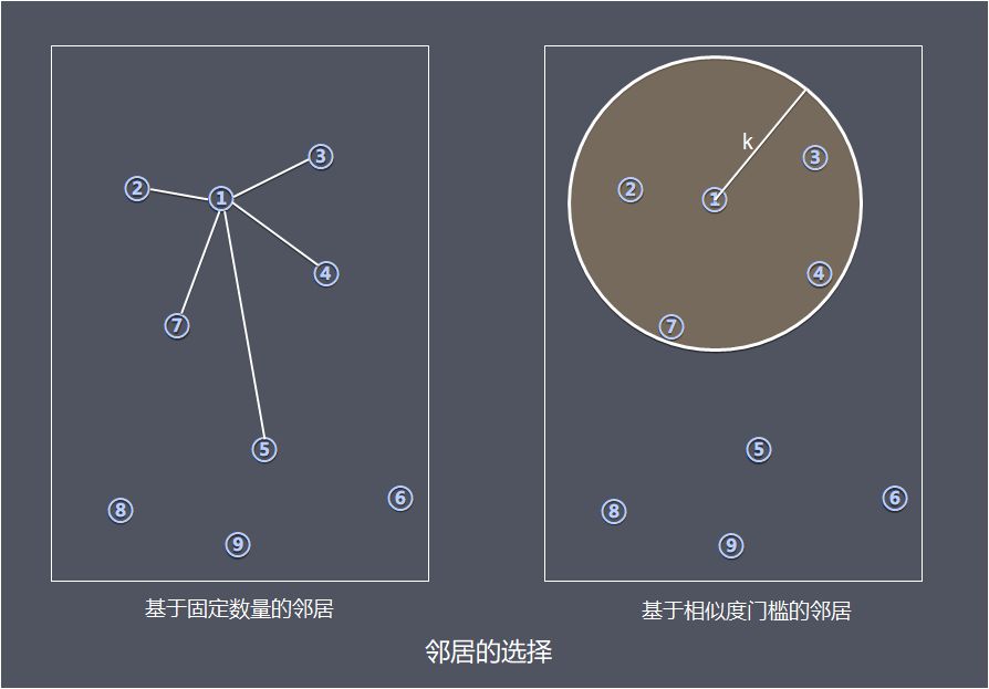 基于固定数量的邻居:该方式直接选择固定数量的邻居,有可能把相似度较小的对象也引入。