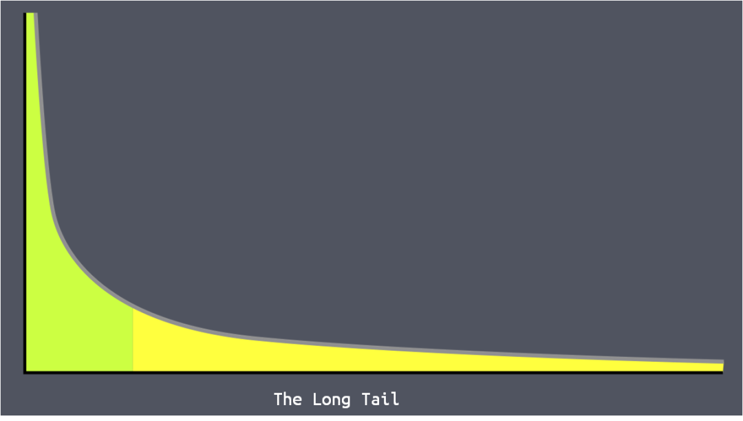 长尾效应是美国《连线》杂志主编 Chris Anderson 在 2006 年出版的《长尾理论》一书中指出,传统的 80/20 原则(80% 的销售额来自于 20% 的热门品牌)在互联网的加入下会受到挑战。互联网条件下,由于货架成本极端低廉,电子商务网站往往能出售比传统零售店更多的商品。这些原来不受到重视的销量小但种类多的产品或服务由于总量巨大,累积起来的总收益超过主流产品的现象。