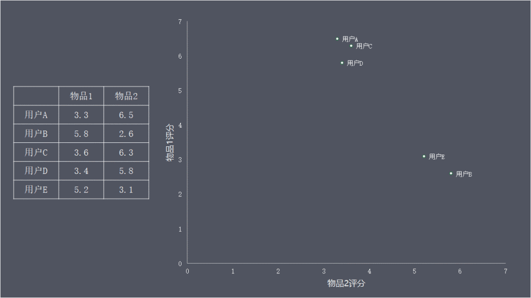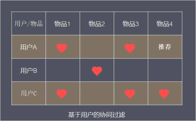 用户 A 与用户 C 的兴趣比较相似,用户 C 喜欢了物品 4,所以给用户 A 推荐物品 4。
