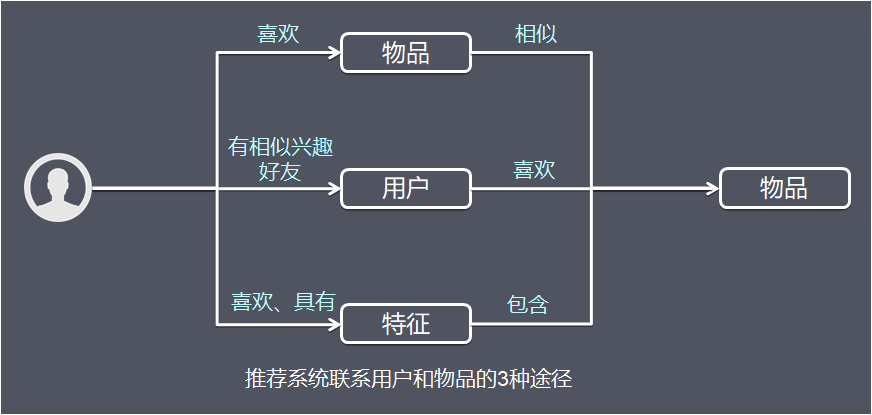 将这 3 种方式都抽象一下就可以发现,如果认为用户喜欢的物品也是一种用户特征,或者和用户兴趣相似的其他用户也是一种用户特征,那么用户就和物品通过特征相联系。