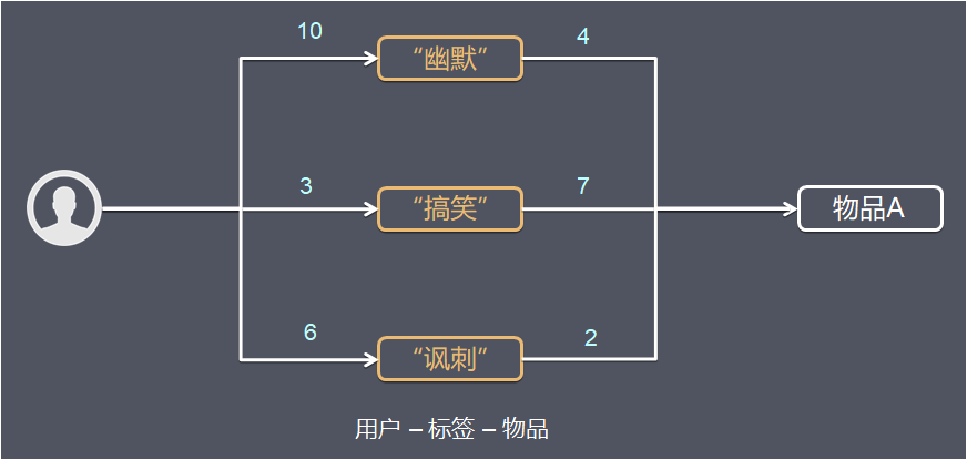 某用户使用过“幽默”标签 10 次,“搞笑”标签 3 次,“讽刺”标签 6 次。这 3 个标签被物品 A 使用的次数分别的 4、7、2。