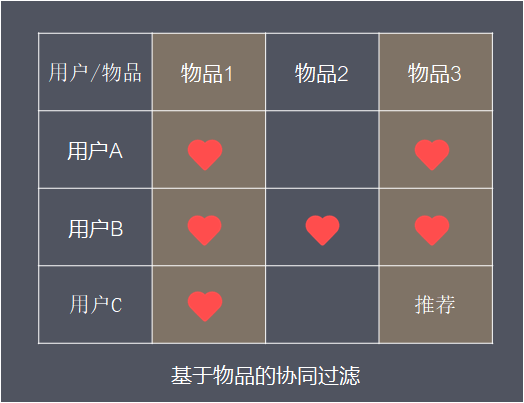 物品 1 和物品 3 都被用户 A 和用户 B 喜欢,所以认为是相似物品,所以当用户 C 喜欢物品 1,就给用户 C 推荐物品 3。