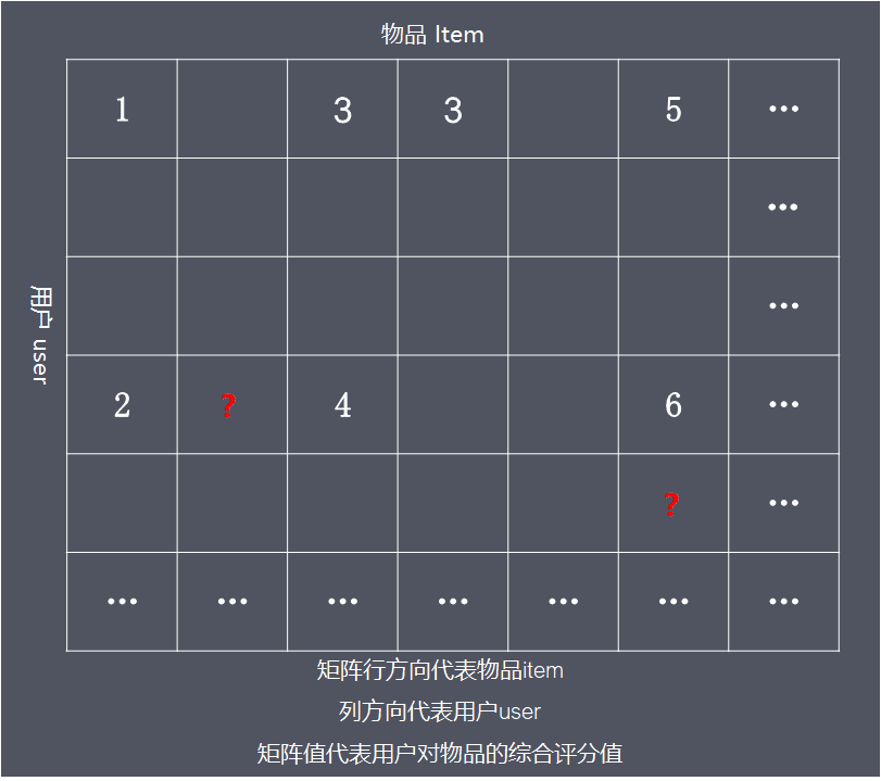 已知用户评分矩阵 Matrix R(一般都是非常稀疏的),推断矩阵中问号处的评分值。