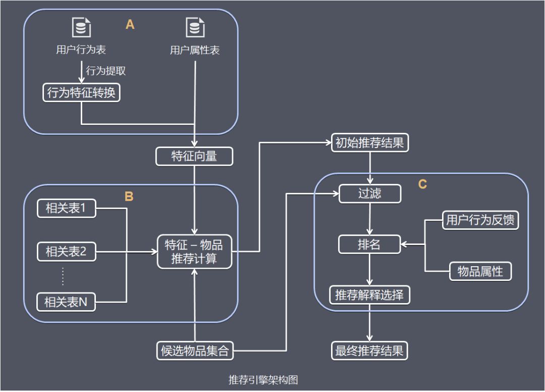 用户行为数据模块:图中 A 部分,该部分负责从数据库或者缓存中拿到用户行为数据,通过分析不同行为,生成当前用户的特征向量。