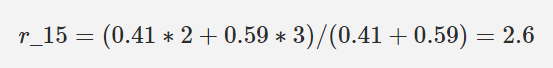 需要用户 5 对物品 1 的评分 r_15,由于物品 3、物品 6 是与物品 1 最为相似的 2 个物品,取相似度作为权重,所以 r_15 可以预测如下: