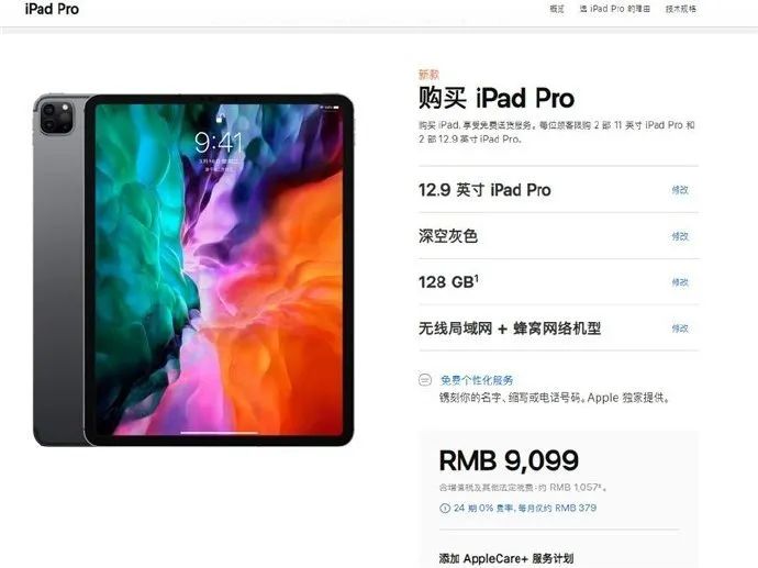 -12.9 英寸 iPad Pro 起售价为:9099 元。
