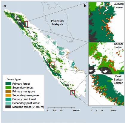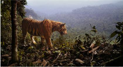 苏门答腊虎的栖息地和研究设计。a. 2012年苏门答腊岛的森林覆盖;b. 研究点放置了相机,用黄色点表示;c. 武吉巴里杉西拉坦国家公园中的苏门答腊虎在山脊上正巡视它的领地。