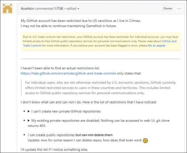 作为全球最大的开源社区网站,GitHub在去年年中,开始对来自被制裁地区的用户加以限制了,分别有来自克里米亚和伊朗的GitHub用户发现自己的账号遭到了网站官方的限制。