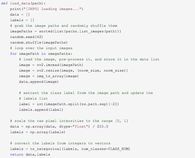 # scale the raw pixel intensities to the range [0, 1] data = np.array(data, dtype="float") / 255.0
